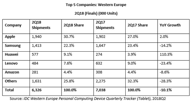 Согласно последним цифрам, опубликованным IDC, планшетный рынок в Западной Европе сократился на 10,1% по сравнению с прошлым годом, и во 2 квартале 2018 года было поставлено 6,3 млн шт. планшетов.