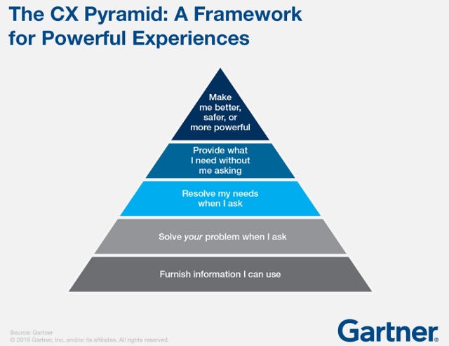 Пирамида Gartner помогает выявить самые действенные формы взаимодействия исходя из нескольких критериев: (a) как срабатывают эти формы взаимодействия, (b) сколько усилий требуется от заказчика, (с) полнота/законченность предлагаемого решения, и (d) эмоциональное восприятие и его изменение, создаваемые таким взаимодействием. Пирамида CX выходит за рамки решения лишь сегодняшних проблем для сегодняшних заказчиков и предусматривает пять разных уровней взаимодействия: