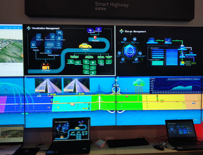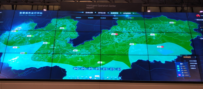 Командный центр «умного города» — используется органами полиции, пожарной службы и т. д. Цветовым выделением показана интенсивность скопления людей, транспорта и прочая информация. При построении решения применялись различные решения Huawei.