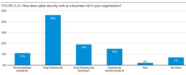 ● Практически 60% финансовых директоров и руководителей финансовых департаментов считают, что кибербезопасность входит в пятерку важных бизнес рисков или даже является самым важным среди них;