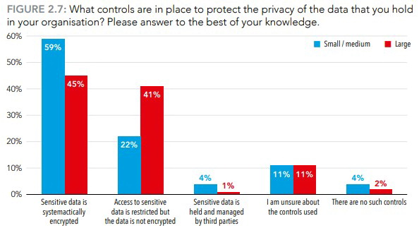 Мошеннический доступ к данным является значительным риском для многих организаций. В ходе исследования у респондентов интересовались, как они защищают частную жизнь и конфиденциальные данные своих клиентов, которые есть в их распоряжении. Их ответы показали, что они, как правило, защищены средствами контроля доступа в виде идентификатора пользователей, а не систематическим шифрованием, при котором читаемая информация становится неразборчивой, и вернуть её в исходный вид можно лишь при при использовании специального шифра. Но пользовательская аутентификация данных свойственна больше крупным корпорациями, компании малого и среднего бизнеса в своей практике чаще используют шифрование.