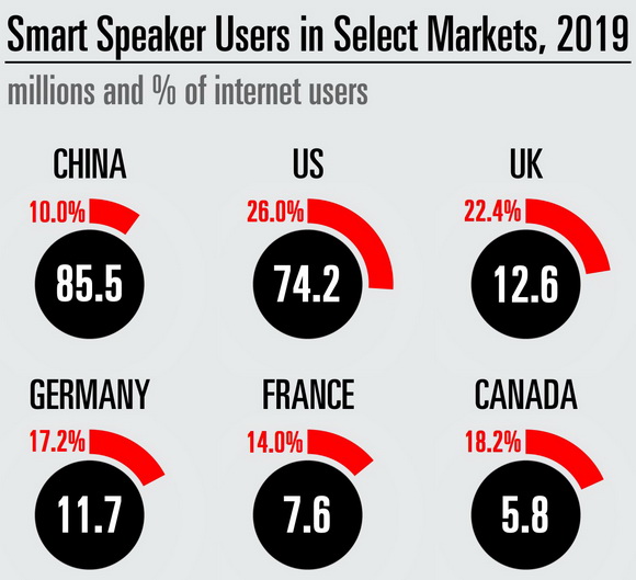 Рынок смарт-спикеров в некоторых странах: указано число проданных устройств и процентная доля от общего числа интернет-пользователей. Источник: eMarketer, 2018