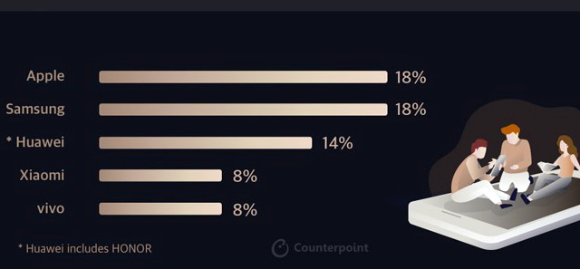 По данным исследования мировые поставки смартфонов в 4 квартале 2019 года достигли 401 млн единиц. В четвертом квартале доли смартфонов Apple и Samsung на глобальном рынке составила 18%, Huawei вместе с брендом Honor завоваел 14% рынка, Xiaomi и vivo получили по 8%. Бренду vivo это позволило занять место в ТОП-5 компаний мирового рейтинга.