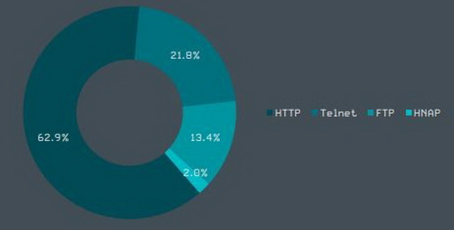 Устройства, которые относятся к Интернет-вещам, часто становятся объектами атак из-за наличия значительного количества уязвимостей безопасности и неправильных настроек. В начале квартала специалисты ESET просканировали более 100 тысяч роутеров во всем мире и обнаружили уязвимости, которые могут привести к несанкционированному доступу злоумышленников. Данные телеметрии ESET продемонстрировали, что для защиты служб достаточно часто используются слабые пароли или пароли по умолчанию. В частности, 63% всех обнаруженных простых комбинаций были зафиксированы в протоколе HTTP.