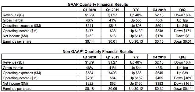 Компания AMD объявила о том, что ее выручка за первый квартал 2020 составила 1,79 млрд долл, операционная прибыль – 177 млн долл, чистая прибыль – $162 млн долл, разводненной прибыли на акцию – $0,14. Согласно показателям выручки non-GAAP (общепринятые показатели прибыли), операционная прибыль составила $ 236 млн, чистая прибыль – $ 222 млн, а разводненной прибыли на акцию – $ 0,18.