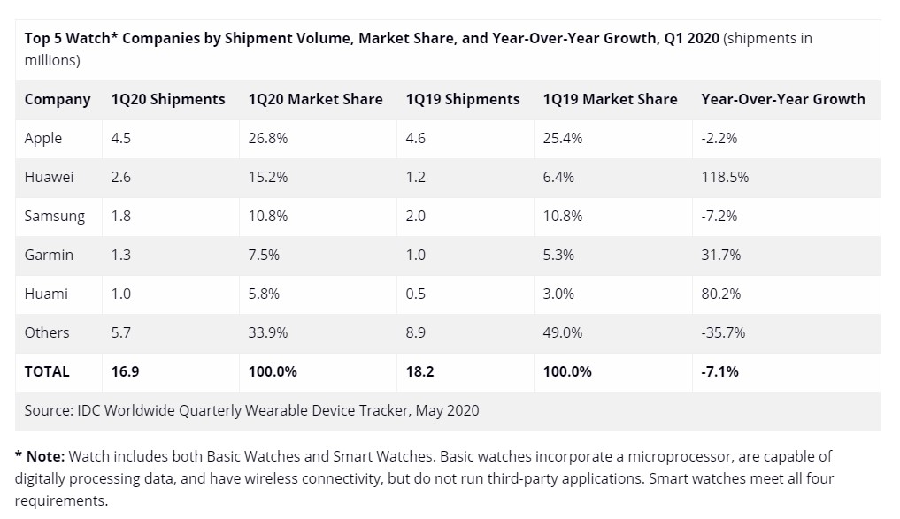 В сегменте смарт-часов глобальные поставки в первом квартале 2020 года достигли 16,9 млн единиц, что на 7,1% ниже, чем в прошлом году. Huawei заняла второе место в рейтинге, отгрузив 2,6 млн устройств — на 118,5% больше, чем в прошлом году. Huawei стала единственным производителем смарт-часов, объемы поставок которого выросли более чем на 100%.