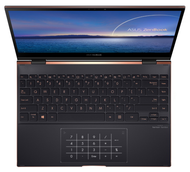 Темная отделка корпуса (Jade Black) красиво контрастирует с металлическими элементами, выполненными в медно-красном цвете, и декоративной полоской из шлифованного алюминия. Высокоточное поворотное крепление ErgoLift позволяет раскрывать экран до 360°, поэтому ZenBook Flip S можно использовать не только как обычный ноутбук, но и фиксировать крышку под любым углом в зависимости от поставленных задач. Инновационный цифровой блок ASUS NumberPad 2.0, встроенный в тачпад, удобен для работы с расчетами, а клавиатура занимает всю ширину корпуса, а в ее правой части нашлось место для колонки дополнительных клавиш.
