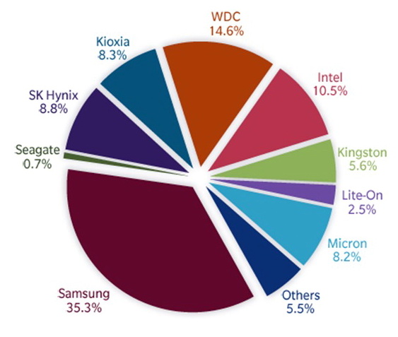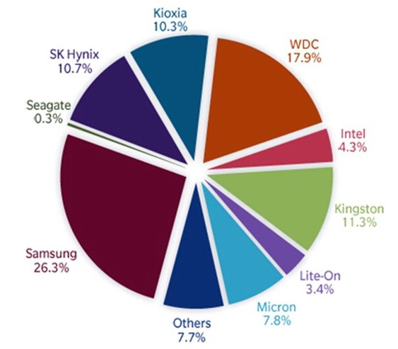 На рынке SSD по-прежнему лидирует Samsung, далее с большим отрывом следуют WD, Kingston, SK Hynix и Kioxia. Intel находится на 7-й позиции.