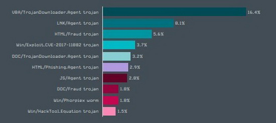 После активного 3 квартала уровень распространения загрузчиков в конце года снизился на 14,7 %. Наибольшее количество атак было зафиксировано в октябре, а самым распространенным стало семейство вредоносных программ VBA/TrojanDownloader.Agent, связанное с Emotet. В частности, операторы Emotet распространяли вредоносные спам-сообщения на тему Хэллоуина с приглашениями на вечеринку. Чтобы узнать необходимые подробности, нужно было нажать на прикрепленный документ, который запускал загрузку Emotet на устройства жертв.