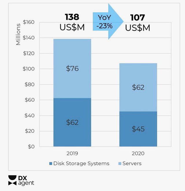 Совокупный объем рынка серверов (x86 и RISC) и дисковых систем хранения данных в Украине в 2020 году уменьшился на 22,6%, до 107 млн долл (в ценах заказчиков). Об этого свидетельствует последний отчет компании DX Agent, который включает как продажи через дилерский канал (93%), так и прямые адресные поставки вендоров украинским заказчикам (7%), в том числе, в рамках программ международного сотрудничества.