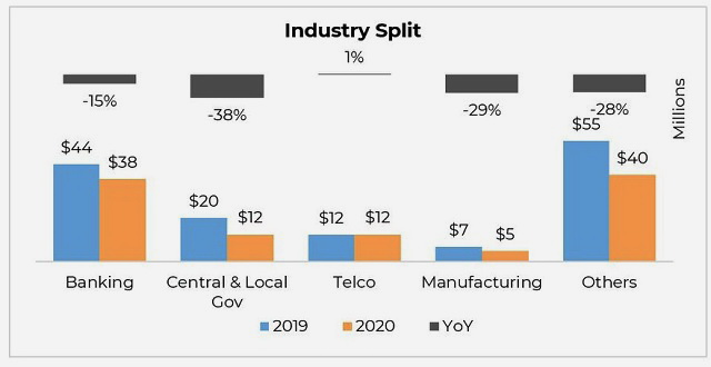 Как отмечают аналитики, сегмент Disk Storage Systems пострадал от кризиса сильнее, чем серверный сегмент — здесь падение составило 27,5%, против 18,6% в продажах серверов. Примечательно, что среди отраслей лучше себя чувствует телеком: операторы не только не сократили закупки систем, а наоборот незначительно их увеличили (плюс 0,7%). По мнению Андрея Головных, главного аналитика DX Agent, это в первую очередь связано с циклами обновления оборудования. Ожидаемо сильно упали закупки в государственном секторе (почти на 38%), и в то же время государственный «Ощадбанк», наоборот, увеличил расходы на 26%.