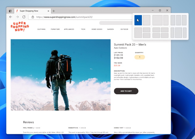 Snap Layouts облегчает организацию окон приложений