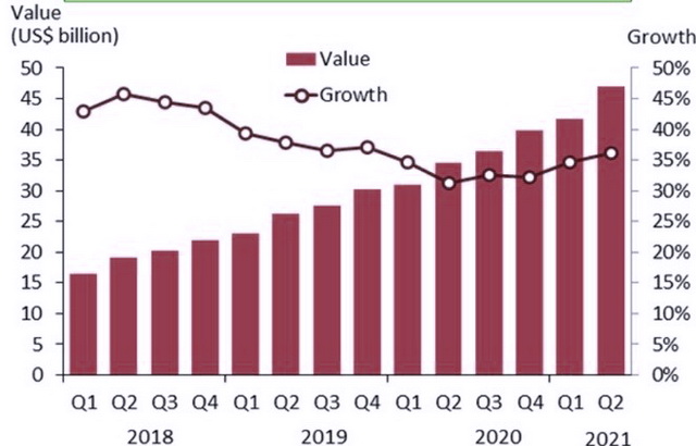По данным исследовательского агентства Canalys, с 2018 года рынок инфраструктурных облаков показывал мощный рост в долларах. В годовом выражении объем рынка рос на величину от 30% до 45%. Если в 1-м квартале 2018 объем рынка составлял немногим больше 15 млрд долл, то во 2-м кв. текущего года этот показатель вырос до 47,0 млрд долл.