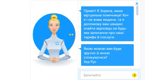 7 июля 2016 года мобильный оператор «Киевстар» запустил первого в Украине чат-бота на сайте и в Facebook под названием «Зоряна». Этот виртуальный ассистент отвечал на популярные вопросы об услугах связи, помогал выбрать и подключить тариф или услугу. Примечательно, что Зоряна не только анализировала запросы по ключевым словам, но и умела задавать уточняющие вопросы. Через несколько месяцев после запуска обнаружился курьезный момент: оказывается, не все пользователи осознавали, что общаются с роботом. И когда Зоряна давала нерелевантные ответы или же вообще не понимала суть вопроса, абоненты выходили из себя и начинали ругаться прямо в чате. Ошибку исправили: теперь в начале беседы Зоряна сразу предупреждает, что она – робот.