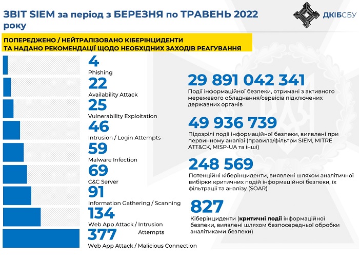 Фахівці Ситуаційного центру забезпечення кібербезпеки СБУ за час проведення військових дій попередила та нейтралізувала у національному кіберпросторі 827 критичних кіберінцидента та кібератак. Це відбулося шляхом безпосереднього аналізу понад 240 000 критичних подій інформаційної безпеки, виявлених у поточний період.