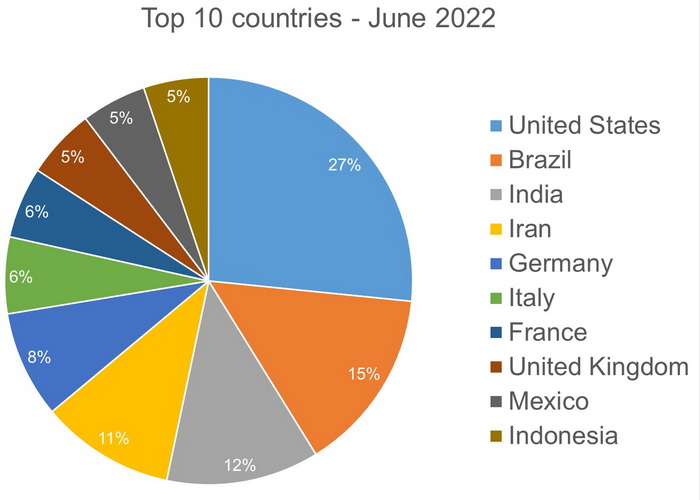 Загалом цього місяця виявили програми-вимагачі зі 156 країн. Програма-вимагач продовжує залишатися загрозою, яка стосується майже всього світу. Нижче наведено список 10 країн, які найбільше постраждали від програм-вимагачів. Багато атак програм-вимагачів, як і раніше, мають опортуністичний характер, і розмір популяції корелюється з кількістю виявлень.