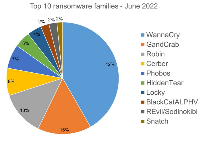 Фішингові атаки часто використовуються як початковий вектор атаки, а зараження програмами-вимагачами є кінцевою стадією ланцюга знищення. Для цього звіту Bitdefender проаналізувала виявлення зловмисного програмного забезпечення, зібране в червні 2022 року за допомогою статичних механізмів захисту від зловмисного програмного забезпечення. Примітка: враховувалась лише загальна кількість випадків, а не те, наскільки значний у грошовому відношенні вплив інфекції. Опортуністичні зловмисники та деякі групи програм-вимагачів як послуги (RaaS) становлять вищий відсоток порівняно з групами, які більш вибірково ставляться до своїх цілей, оскільки вони віддають перевагу обсягу, а не вищій вартості.
