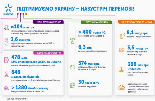 У фокусі роботи Київстар – безпека абонентів та підтримка їх зв`язку з рідними та близькими. Компанія продовжує розвивати цифрові продукти, які допомагають жителям України дистанційно працювати, навчатись, отримувати медичне обслуговування. Зокрема, з метою розвитку нових продуктів для приватних і корпоративних клієнтів, Київстар у серпні 2022 року зробив інвестицію у Helsi.me - лідера ринку IT рішень для закладів охорони здоров’я. Для підтримки дистанційного навчання студентів та школярів, компанія продовжує надавати безкоштовний інтернет-доступ до навчальних курсів і платформ, щоб молодь України могла продовжувати свою освіту.