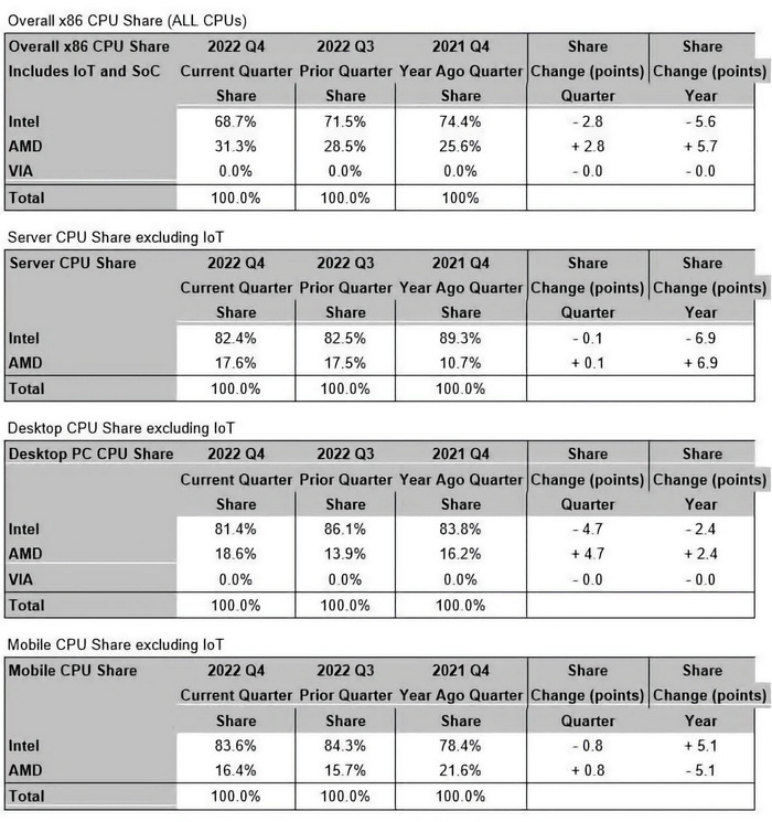 Без урахування чипів Arm, у 2022 році було поставлено близько 374 млн процесорів, що на 21% менше, ніж у 2021 році. У 2022 році доходи від процесорів впали на 19% до 65 млрд дол. Основною причиною є коригування запасів, яке мало більший вплив, ніж зниження продажів. Це означає, що хоча поставки різко впали, це не обов’язково вказує на таке ж різке падіння продажів кінцевим користувачам.