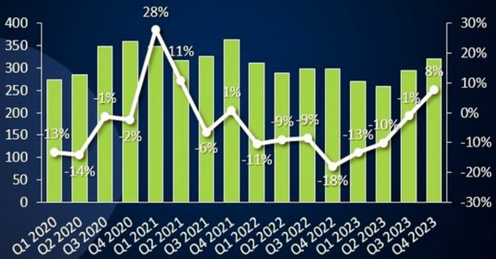 З першого кварталу 2020 р. аналітики Canalys відзначили тільки три квартали, в яких глобальний ринок смартфонів показав зростання продажів рік до року: це 1-й та 2-й квартали 2021 року (зростання 28% та 11% відповідно) та 1-й квартал 2022-го (скромний показник в +1%). І хоча в 2020 році відвантаження зростали протягом усього року (див. графік), у порівнянні з аналогічними періодами 2019 року показники все рівно були нижчими. Але 4-й квартал 2023 року виявився дуже успішним – в світі було поставлено в канал на 8% більше, ніж за аналогічний період роком, в кількісних показниках це дорівнює 320 млн. смартфонів.