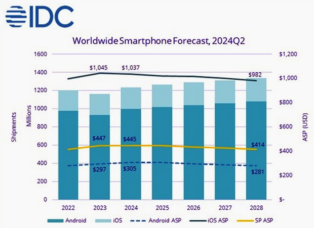 Експерти вважають, що постачання Android-смартфонів зростатиме у дев'ять разів швидше (7.1%), ніж на iOS (0.8%). Помірне зростання поставок смартфонів від Apple викликане посиленням конкуренції в Китаї та високою базою порівняння щодо минулого року. Однак для iOS тут багато залежатиме від успіхів використання GenAI у моделях iPhone 16, які скоро вийдуть на ринок. А також від того, коли у компанії в Китаї з'являться партнери з ШІ. У IDC очікують покращення показників з продажу iOS-смартфонів у 2025 р. — зростання на 4% рік до року завдяки новим розробкам Apple. Аналітики прогнозують швидке оновлення моделей iPhone у 2025 р.