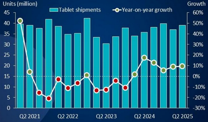 За даними Canalys, у світовий канал продажів у 2-му кварталі 2025 року було відвантажено 39 млн планшетів — на 9% більше порівняно з аналогічним періодом минулого року і на 5% більше, ніж у попередньому кварталі. Аналітики пояснюють це двома факторами: сильним попитом на планшети в Китаї та регіоні EMEA і запуском масштабної освітньої програми GIGA School у Японії. У межах цієї програми лише за перше півріччя 2025 року закупили 11 млн хромбуків — термінальних планшетів, що здебільшого призначені для вебсерфінгу та роботи з хмарними сервісами Google.