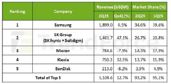 Компанія TrendForce зафіксувала відчутне зростання виручки у сегменті корпоративних твердотільних накопичувачів за підсумками ІІ кварталу 2025 року. Лише п’ять провідних виробників — Samsung, SK Group (SK hynix і Solidigm), Micron, Kioxia та SanDisk — реалізували продукції на 5,1 млрд дол. США, що на 12,7% більше, ніж у першому кварталі.